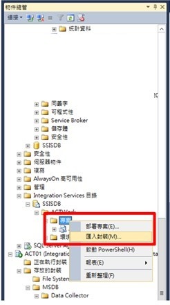 進到Management Studio 工具→Intergration Service目錄下→右鍵專案→匯入封裝