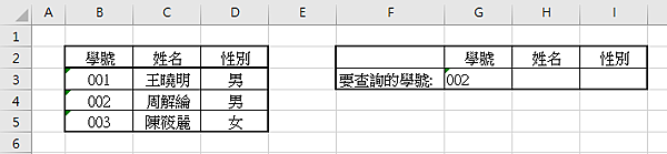 例如想要在下圖右側學號(G2) 輸入002 學號 ,並透過該學號找出學號002的學生資料時時